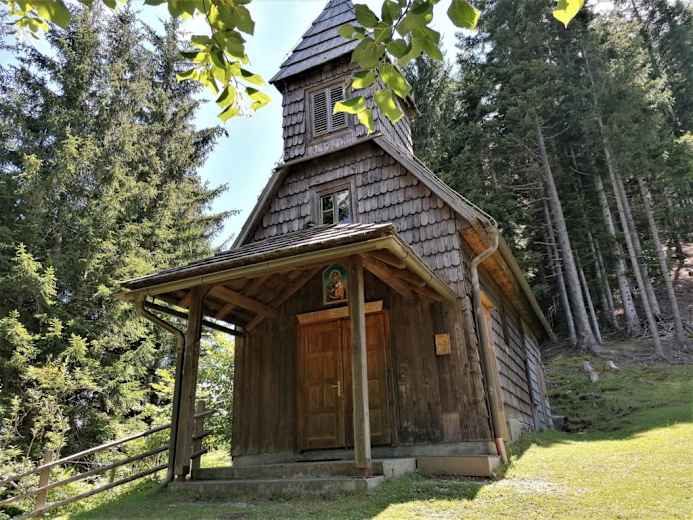 Von hier gehen wir (oder fahren mit dem Taxi) zur Erlebniswelt im Naturschutzgebiet Trögerner Klamm. Hier treffen wir auf die WWW Via Alpina und den Eisenwurzenweg 08. Mit dem KGW und der Weg-Nr. 628 gehen wir nach oben zum Ortsteil Trögern, wandern an der Heiligen-Kreuz-Kirche und an Kepp vorbei und erreichen über den Pasterksattel das Vellachtal mit dem Christophorusfelsen.