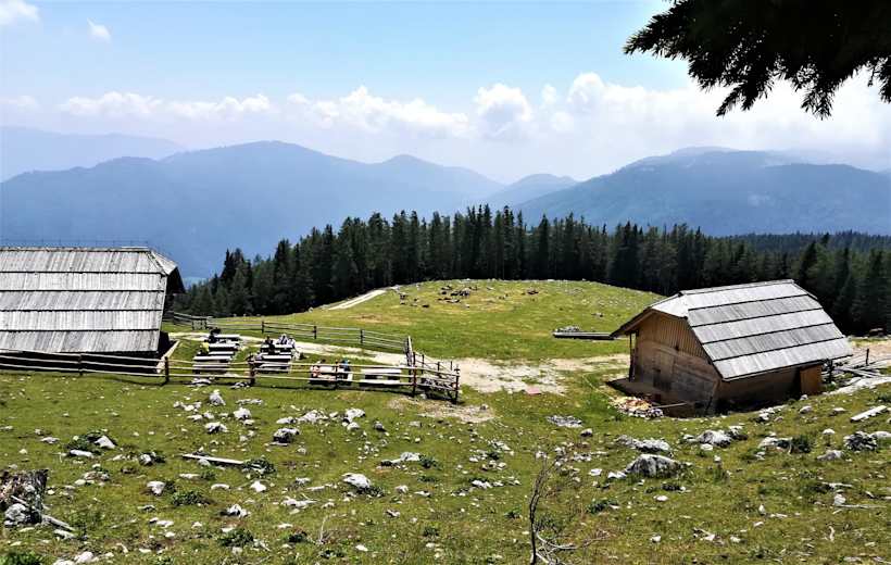 Ein Asphaltweg bringt uns an Streusiedlungen vorbei und aufwärts zu einem sehr schönen Teil der Steiner Alpen/Kamniško-Savinjske-Alpe, zur Delesko vška planota veža. Stark ansteigend und vorbei an Podveža, Kladnik, Planica und Planina Vodole nähern wir uns den faszinierenden Berggipfeln der Steiner Alpen. Nach Polanski Mima erreichen wir Sedelce und genießen den Blick auf die Korošica-Ebene mit dem im Jahre 2018 abgebrannten Kocbekov dom na Korošici (ab 2025 wieder voll benutzbar – bis dahin gibt es 8 Betten im Container). Mit dem Überschreiten von Srebno sedlo und dem Nahekommen an die Planjava (höchster Punkt der 5. Etappe) erleben wir noch knapp vor der Zielerreichung herausfordernde Kletterabschnitte - wir erreichen bei herrlicher Aussicht Kamniška koča.