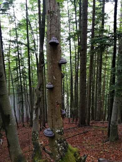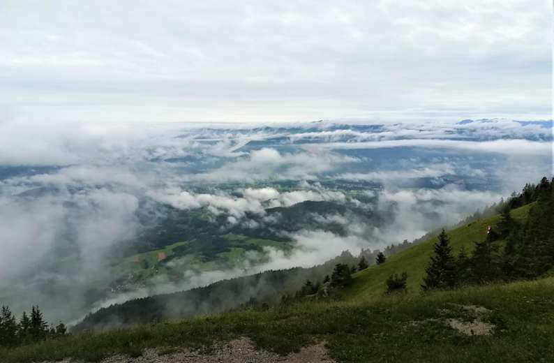 Nach längeren, teilweise schönen Naturpfaden in Mischwäldern in Richtung Norden erreichen wir den Koča na Prevalu mit Blick auf die Begunjščica. Wir gehen nach Nordwesten und verlassen die Weg-Nr. 1 auf einem Schotterweg - er führt uns zum Tomčeva koča. Hier verabschieden wir uns von der Begunjščica und wenden unsere Blicke allmählich zur Südseite des Hochstuhls/Stols - bald treffen wir auf einer Alm den Tinčkova koča. Wir erreichen das Etappenziel zumeist auf bewaldeten Wegen über die Zabreška planina und Živovniška planina südwestlich des Hochstuhls/Stols nach ca. 23 km und ca. 1 750 Hm: der Valvasorjev dom pod Stolom.