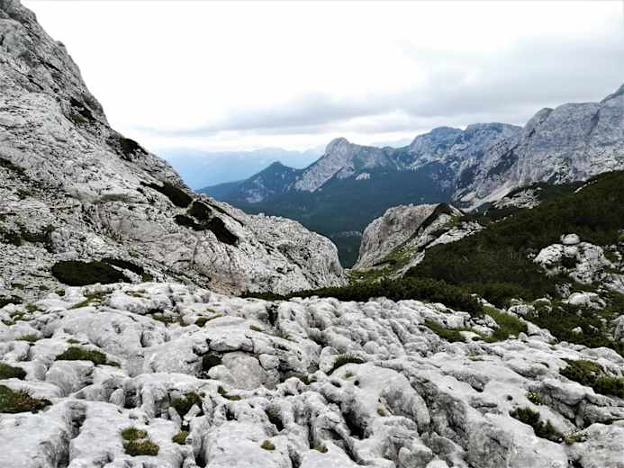 Kurz danach beginnt der immer steiler werdende Pfad - wir nähern uns nördlich der Kurica dem Sattel/Übergang zur Wanderkreuzung Konjski preval. Nun führt uns der Pfad, an dem an mehreren Stellen kurze seilversicherte Steige zu überwinden sind, westlich des Vernar über die Konjska planja leicht abwärts, begleitet von herrlichen Ausblicken innerhalb der Triglav-Gebirgsgruppe, zum Etappenziel Vodnikov dom na Velem polju.
