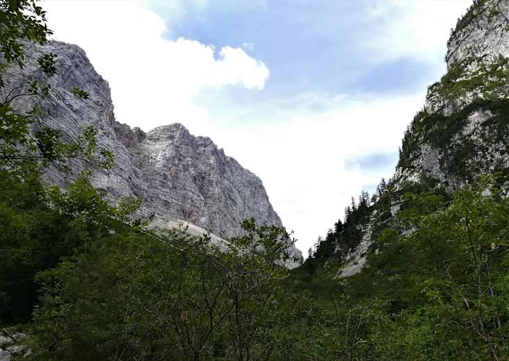 Wir genießen auf den nächsten Kilometern die Weite des Tals „Krma“, speziell um den bewirtschafteten Kovinarska koča v Krmi. Kurz darauf wird es enger und ansteigender - wir erreichen Pri lesi, dem letzten PP (ab hier gibt es auf dieser Etappe kein Wasser).