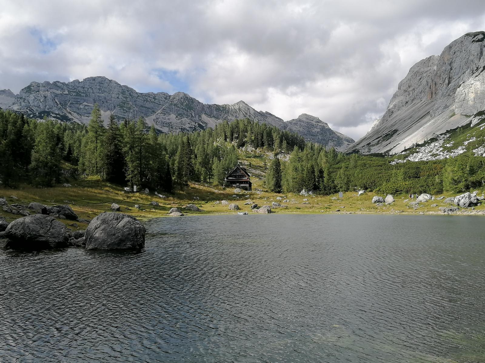 Hier verlässt uns die Spp Nr. 1 - uns bleibt nun die Via Alpina R12 und der "Geologische Wanderweg" - so gehen wir zum Sattel nach SO zurück und wenden uns nach halbrechts und nach oben zum kahlen Gebiet Hrivarice. Ab dem Zeleno jezero/jezerih treffen wir abermals auf den Spp Nr. 1. Wir besuchen noch den Zasavska koča na Prehodavcih, um einen Blick auf den Triglav zu werfen. Wieder zurück führt uns der Weg östlich am Ledvicah jezero/jezerih vorbei, um nach ca. 2,4 km das Etappenziel, den von Teichen umgebenen Koča pri Triglavskih jezerih zu erreichen.