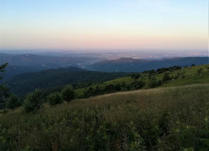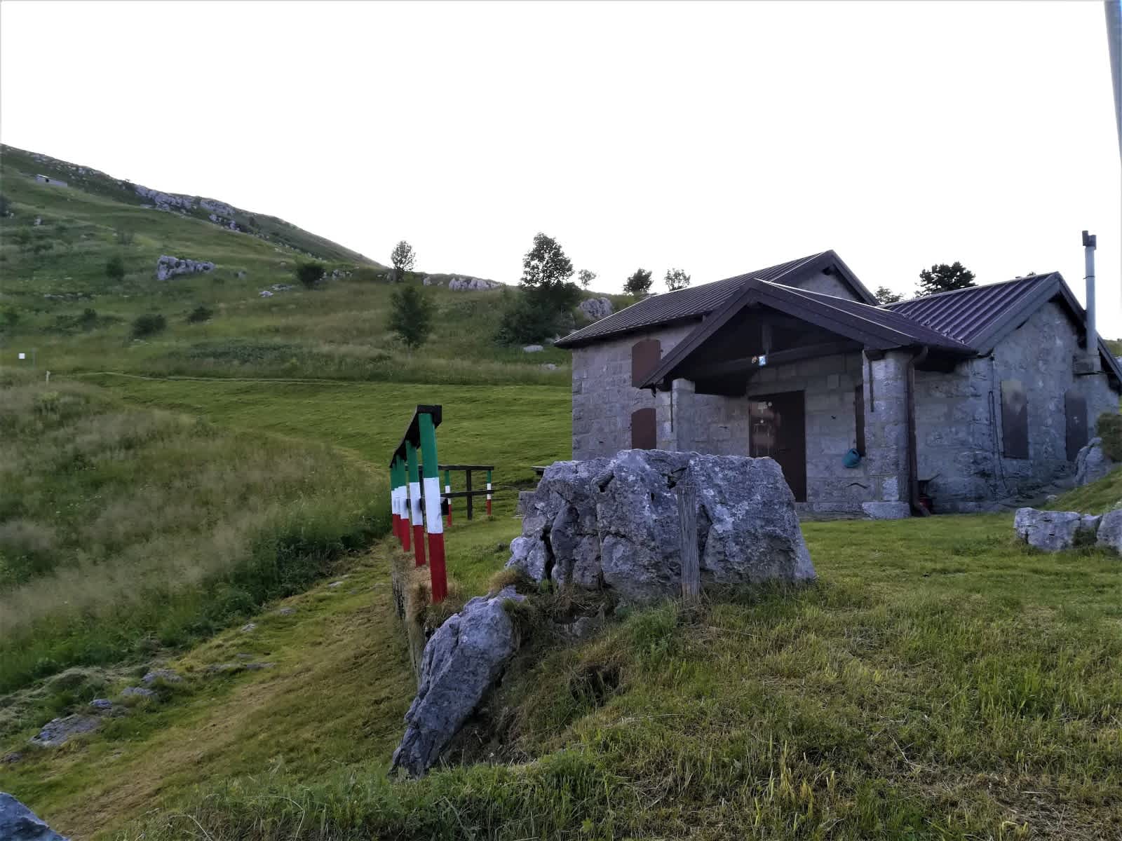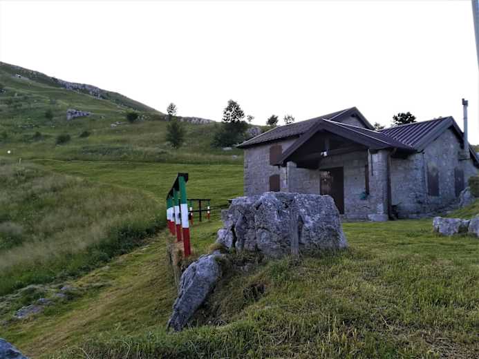 Nach dem Verlassen der Hütte wenden wir uns nach NW, dem Sent. Nat. M. Matajur (750) zu und erreichen die Marsinska planina - hier treffen wir wieder auf den Sentiero Italia, die Via Alpina (gelber Weg), die Weg-Nr. 725 sowie auf den Sentiero Naturalistica. Sie führen an der Kirche S. Lorenzo vorbei und wandern - mit Blick auf das Naturschutzgebiet Monte Mia - auf Stupizza zu.