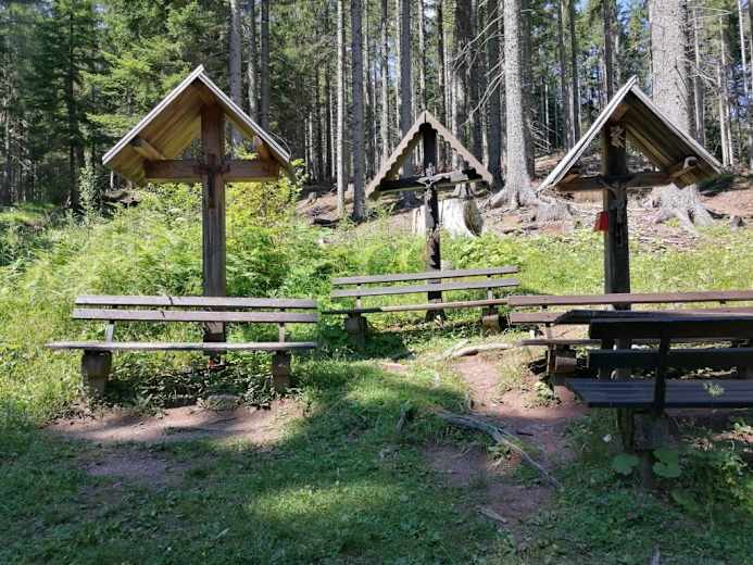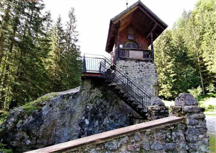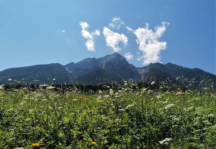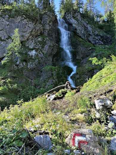 Nach dem Verlassen der Wolayersee Hütte in Richtung Westen begleitet uns der Südalpenweg 03, der Karnische Höhenweg/Friedensweg und der Kärntner Grenzweg sowie die Weg-Nr. 439 bzw. 1 OG zur Oberen Wolayer Alm. Knapp vor dem Hilden-Wasserfall verlassen uns die Weitwanderwege - wir wenden uns nach NO/N und erreichen die Untere Wolayer Alm und bald danach den Parkplatz mit der nahen Hubertuskapelle. Von der Kapelle gehen wir kurz zurück, um an der Weggabelung spitzwinkelig der Weg-Nr. 438 entlang zu wandern - wir treffen auf den Weiler Wodmaier.