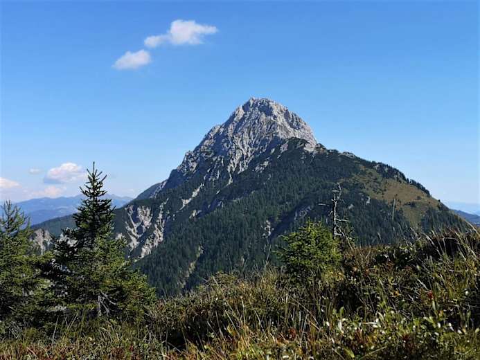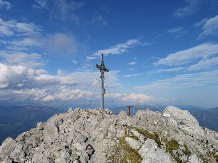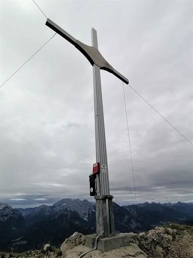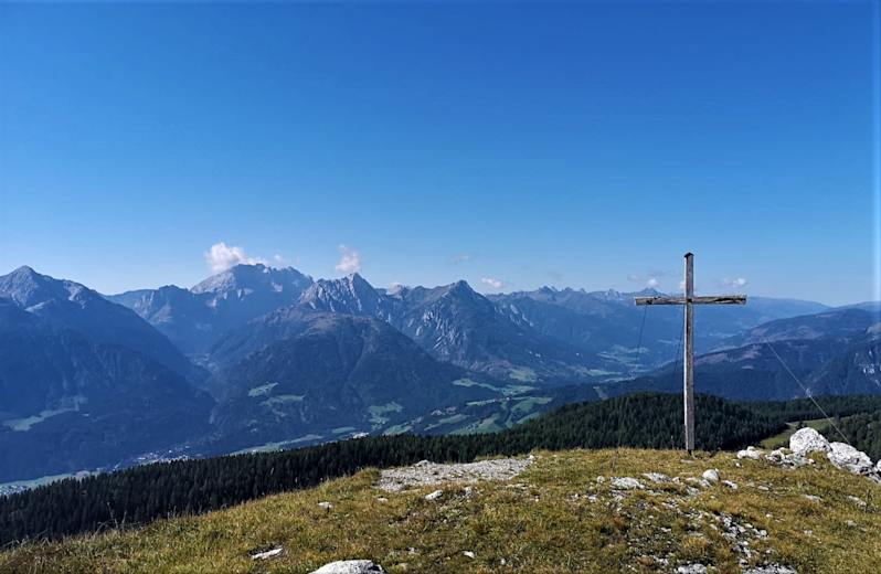 Blick von der Ochsenalm Foto: Dr. Valentin Wulz Jukbichl mit Gipfelkreuz und Wanderzeichen JKAT Foto: Dr. Valentin Wulz