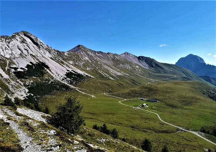 Nach der fordernden (siehe Sicherheitshinweise!!) Reißkofel-Überschreitung mit teilweise seilversicherten Abschnitten, gehen wir auf das Köfele Törl zu, um sich dann nach li., Norden der Weg-Nr. 235 zuzuwenden - über den Padiaursteig (teilweise seilversichert) erreichen wir das Etappenziel, die E. T. Compton Hütte.