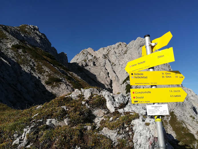 Von der Compton Hütte gehen bzw. klettern wir über den Padiaursteig zurück zur Schaflerhöhe - hier treffen wir wieder auf den Gailtaler Höhenweg 229. Nun gehen wir in Richtung Osten südlich des Dristallkofels auf den Sattelnock zu, um bald danach über den Kumitschkogel auf die Weißbriacher Selbstversorgerhütte (mit Wasserentnahmestelle) zu stoßen.