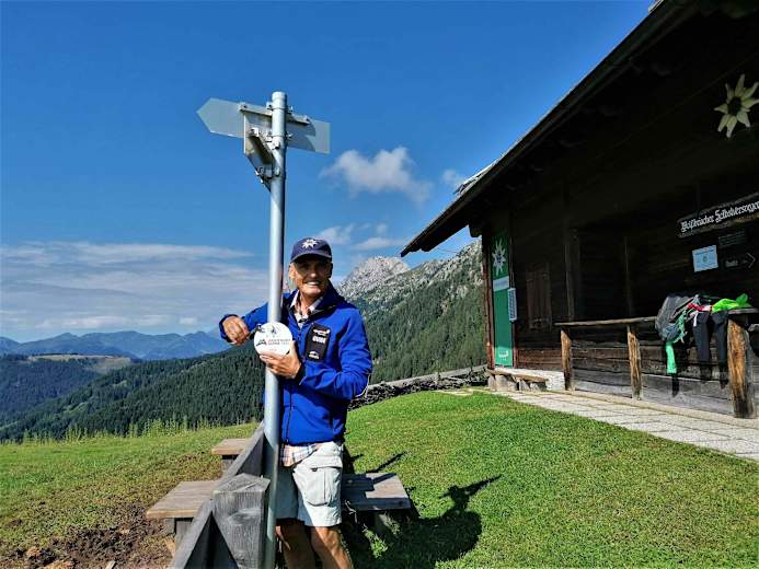 Weißbriacherhütte - JKDW-Projektmitarbeiter Valentin bei der 99sten Montage - dahinter der Reißkofel Foto: Dr. Valentin Wulz