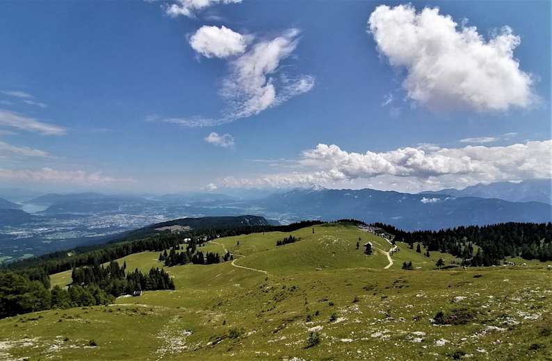 Wir wandern vom Dobratsch Gipfelhaus mit der Weg-Nr. 229 und 291 nach unten an den Nocken und der Aichingerhütte vorbei zum Alpengarten. Die Markierungen 229 und 292 führen uns über die Kaserin Hütte, den Hundsmarhof zur Völkendorfer Alm. Wir gehen nun nördlich des Tscheltschnigkogels vorbei, überqueren die Villacher Alpenstraße und erreichen - knapp vor dem Warmbad Villach - den Salzsteigweg und somit das Villacher Feld.
