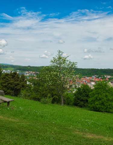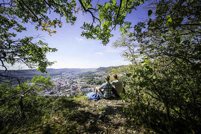 Es geht durch das Täle und erreicht den Traufgang Schlossfelsenfad. Hier gibt es immer wieder schöne Aussichtspunkte und einen Rastplatz mit tollem Ausblick auf Albstadt-Ebingen. Man kann noch einen Abstecher zum Schlossfelsenturm unternehmen und anschließend wieder zurück zum Parkplatz am Waldheim wandern.