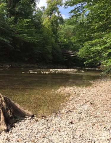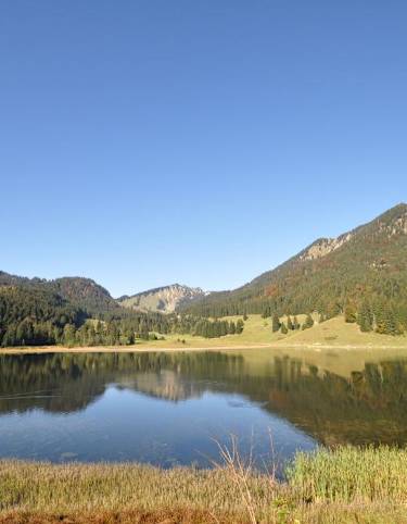 Man wandert am Waldrand entlang und geht an einem Kreuz nach rechts und weiter bis zum Steinbach. Dort wandern wir nach rechts am Bach entlang bis zu einer kleinen Brücke. Vor dieser gehen wir nach links und erreichen das Naturbad Samerberger Filze.