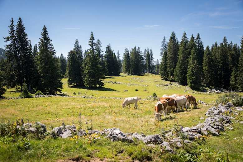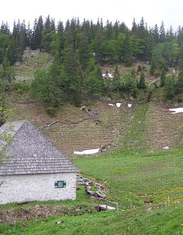 Man geht über die Wiese und trifft auf einer Anhöhe wieder auf einen Weg. Dieser führt nun durch die karstige Landschaft des „Kessels“, ehe man eine Weggabelung erreicht. Hier hält man sich abwärts zur Schwarzalmhütte.
