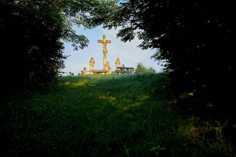 Zurück wandert man dann über den Kalvarienberg, der als Besonderheit sowohl auf der Stieferner als auch auf der Schönberger Seite einen Kreuzweg aufweist. Beide treffen am Gipfel bei der Kreuzigungsgruppe aufeinander. Von dort führt der Weg analog dem Waldlehrpfad zurück nach Schönberg.