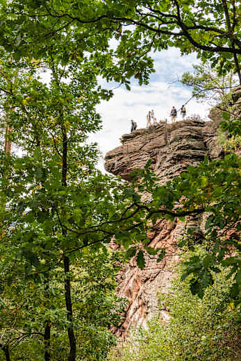 Nun folgt die atemberaubende Kammwanderung zum Hühnerstein. Man wandert vorbei an mächtigen Felsen und bekommt immer wieder tolle Ausblicke. Der Hühnerstein ist sicherlich die spektakulärste Erhebung auf dieser Wanderung. Es ist der Grenzfelsen zwischen Hauenstein und Schwanheim. Über eine Leiter kann man auf eine Aussichtsplattform steigen und genießt einen grandiosen Rundumblick.