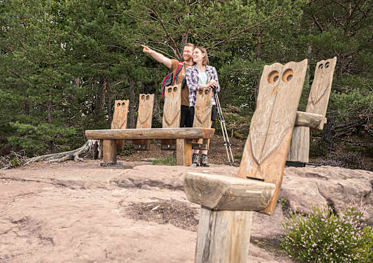 Die Eulenfels-Tour führt auf schmalen Pfaden durch den Pfälzerwald. Höhepunkt ist das Aussichtsplateau auf dem Eulenfels, von dem sich ein grandioser Rundumblick bietet.