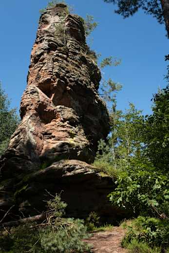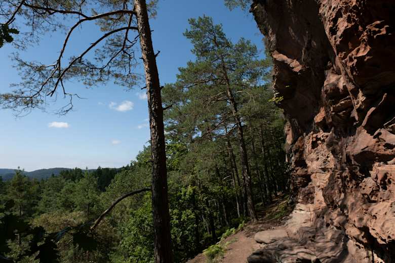 Vom Parkplatz an der Däumling-Schuhfabrik folgt man einen Forstweg bis zum Retschelfelsen. Ein schöner Pfad führt über den Grat zum Eisenbahnfelsen. Vom Wandfuß genießt man einen tollen Ausblick auf den Retschelfelsen und das Dahner Felsenland. Es geht weiter zum Raubergfelsen und dann hinunter zum Reinigshof.
