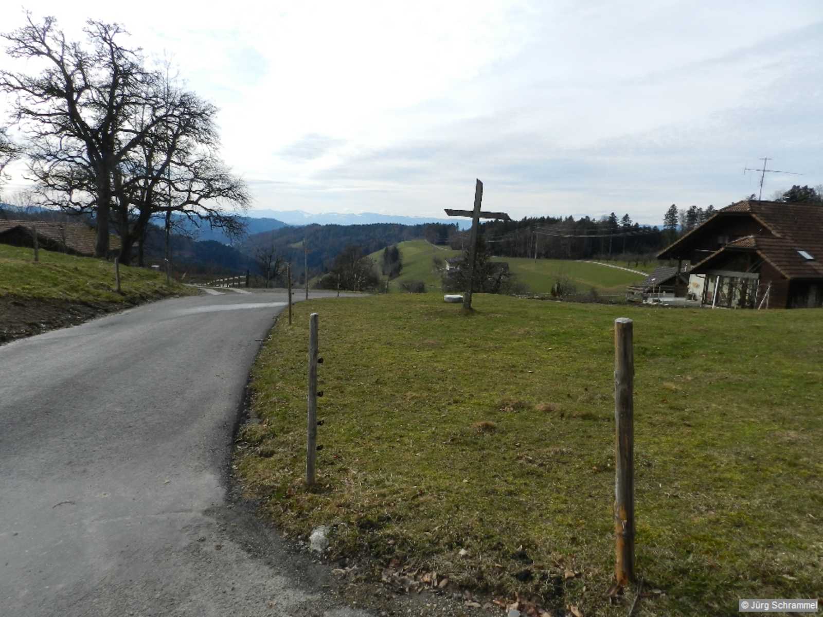 Von hier wieder flach oder nur sanft ansteigend zum Wannenrain und nach Feldlimoos. Bei P. 681 überschreiten wir die Grenze zum Kanton Luzern (Grenzstein). Bei zwei Bänken wenig später in den Wald und aufwärts zu P. 754 und damit zum höchsten Punkt unserer Wanderung.