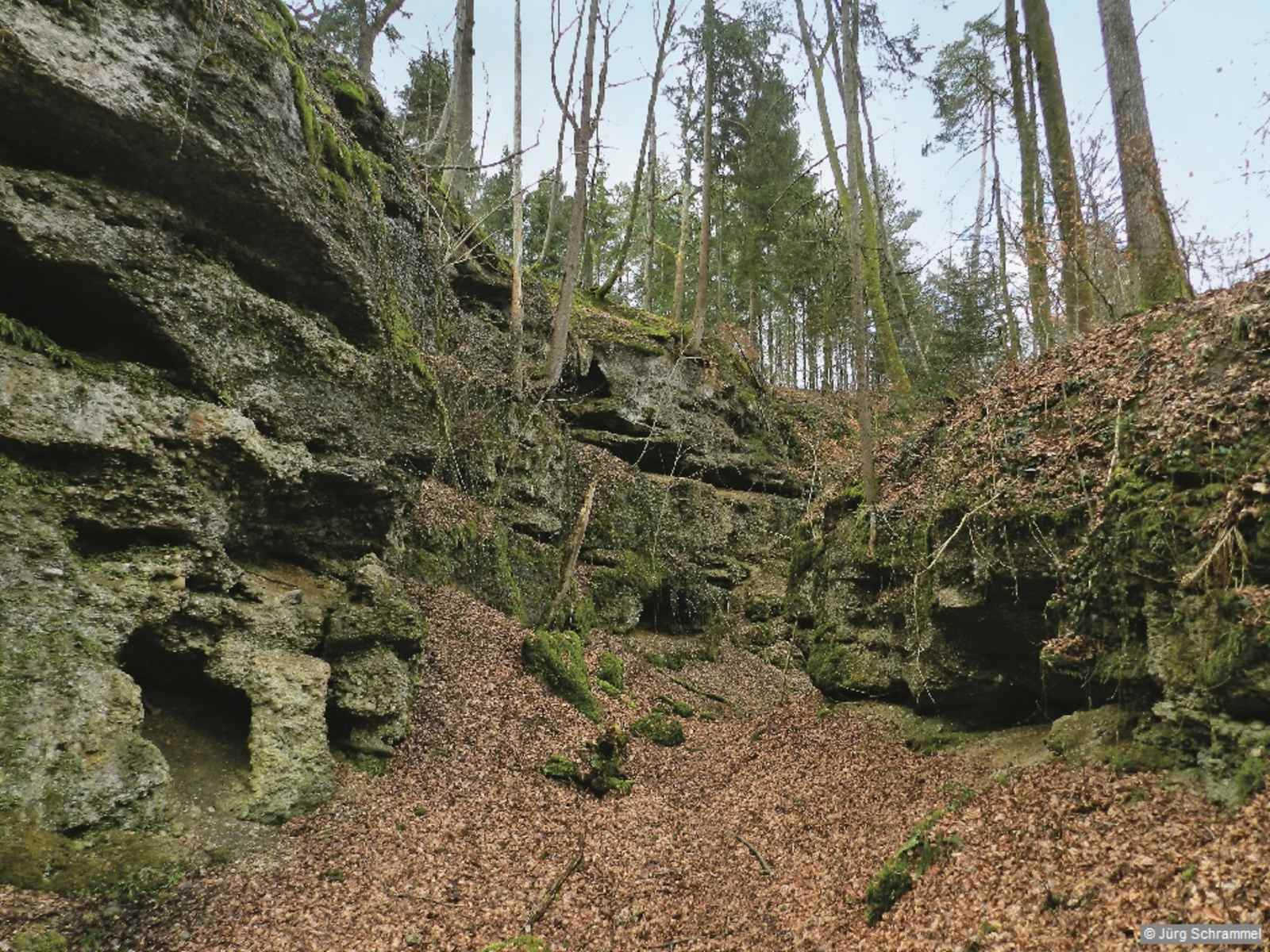 Vor uns erblicken wir in einiger Entfernung eine markante Nagelfluhwand und darin den Eingang zum Erdmännliloch. Foto: Jürg Schrammel, Rother Bergverlag
