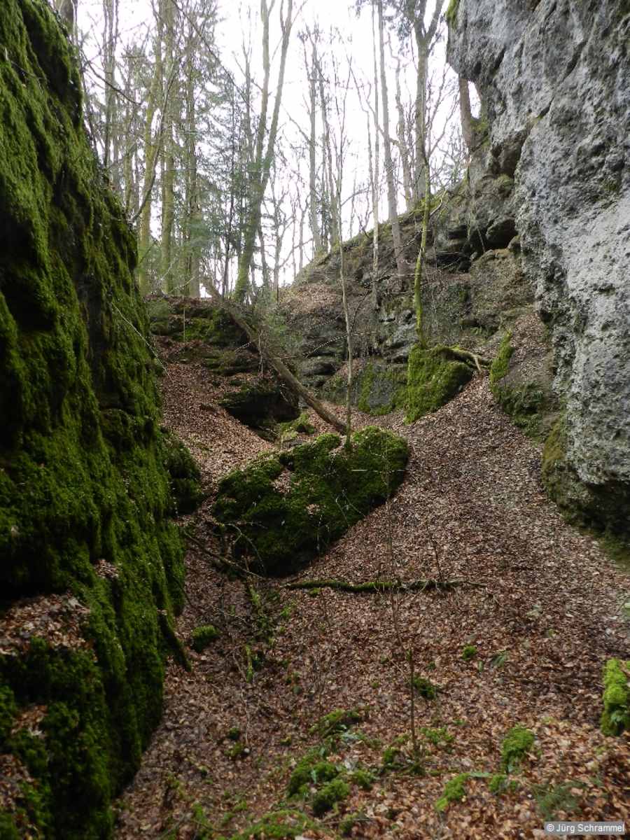 Hier benützen wir keinen der beiden mit einem Eidechsensymbol markierten Wege, sondern wählen stattdessen den steilen Pfad, der unmittelbar hinter der Infotafel beginnt. Er steigt knapp 100 m in Waldrandnähe an (als eine Art Hohlweg), holt dann nach rechts aus und erreicht eine etwas flachere Stelle, wo mehrere Wege zusammenlaufen. Vor uns erblicken wir in einiger Entfernung eine markante Nagelfluhwand und darin den Eingang zum Erdmännliloch. Wir erreichen es, indem wir zunächst einem schmalen Weg einige Schritte nordwärts folgen und dann auf steilen Pfadspuren direkt zum Höhleneingang ansteigen.