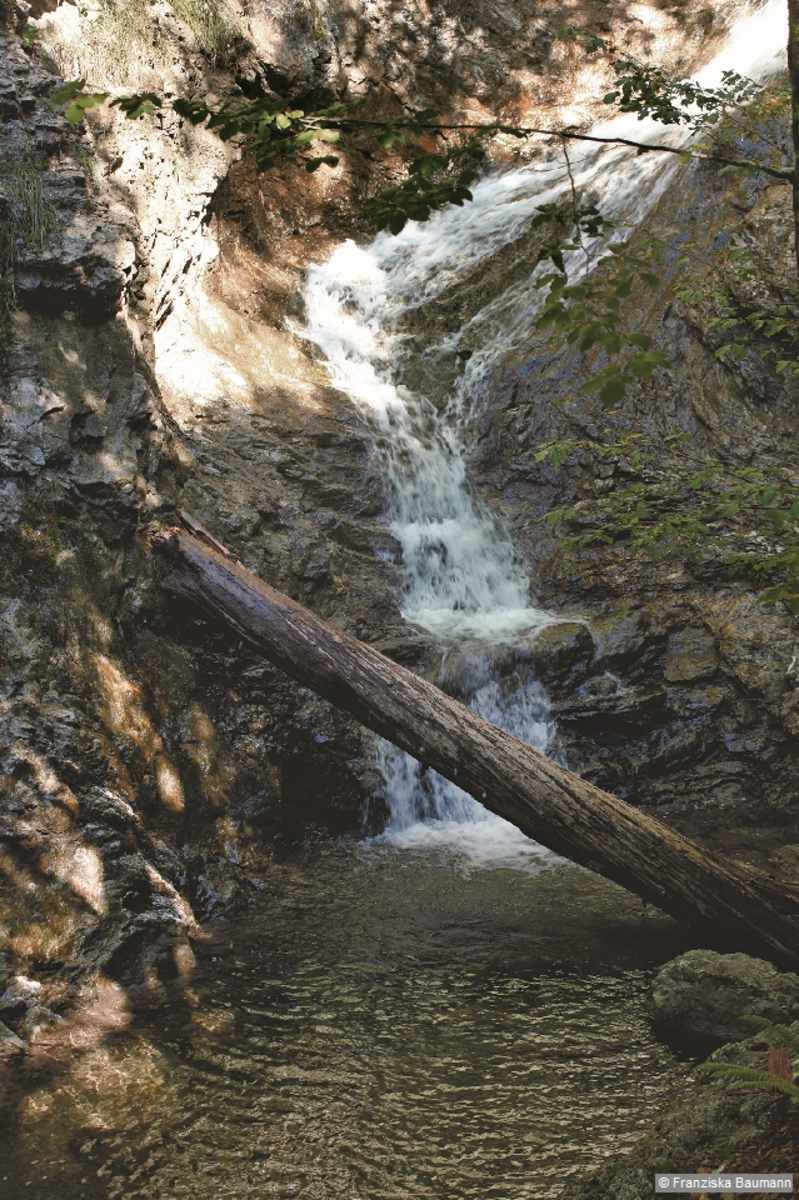 Am Gasthaus gehen wir rechts zum Waldrand und kurz hinunter in den Hirschbachtobel. Wir überqueren den Bach und folgen nun dem abwechslungsreichen Schluchtsteig in das Tal hinein. Er fällt zum Bachbett steil ab und ist in einigen Passagen felsig. Drahtseile geben Halt. Bei einer Brücke bleiben wir zunächst am rechten Bachufer und wechseln erst beim folgenden Steg die Bachseite. Der Pfad steigt über den bewaldeten Hang an und führt uns immer weiter in die sich verengende Schlucht hinein. Über eine abschüssige Wegpassage halten wir auf die Krähenwand im Talschluss , 1.080 m, zu und überqueren unter den senkrechten Abbrüchen mit ihren Wasserfällen noch einmal den Bach. In zahlreichen kleinen Kehren geht es nun über einen steilen Hang hinauf. Einige ausgesetzte, gesicherte Abschnitte fordern auch hier Aufmerksamkeit. Der Steig mündet schließlich in einen Forstweg, den wir gleich wieder nach links verlassen. Im Wald ansteigend kommen wir zu einer Verzweigung. Für eine kürzere Runde könnte man links gleich den Hirschberg ansteuern (45 Min.). Wir wandern rechts über einen Wiesenrücken bergauf und treffen auf einen breiten Alpweg, der uns um den Kreuzbichl herum zur Hirschalpe, 1.493 m, bringt. Dort lässt es sich gemütlich und aussichtsreich rasten.