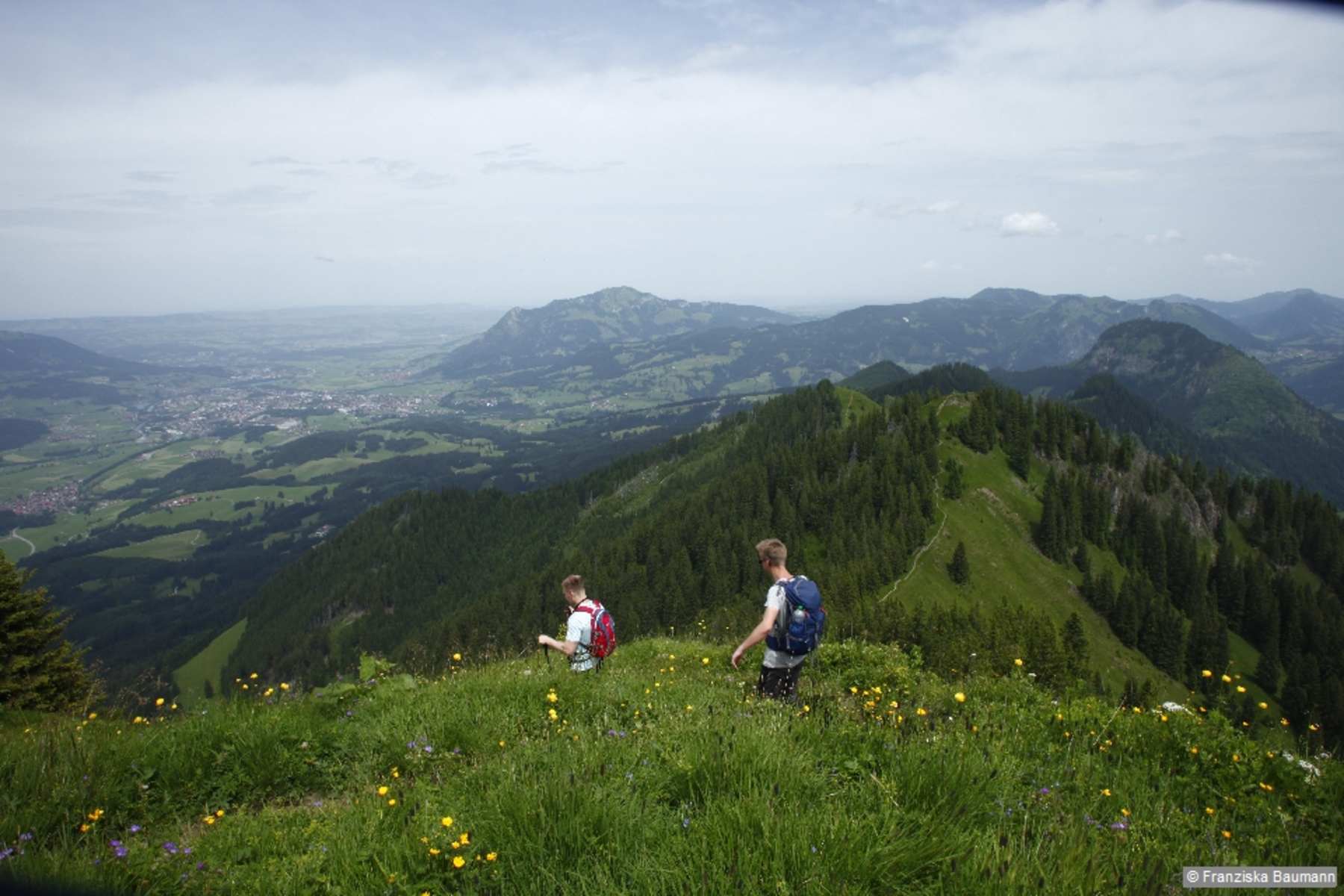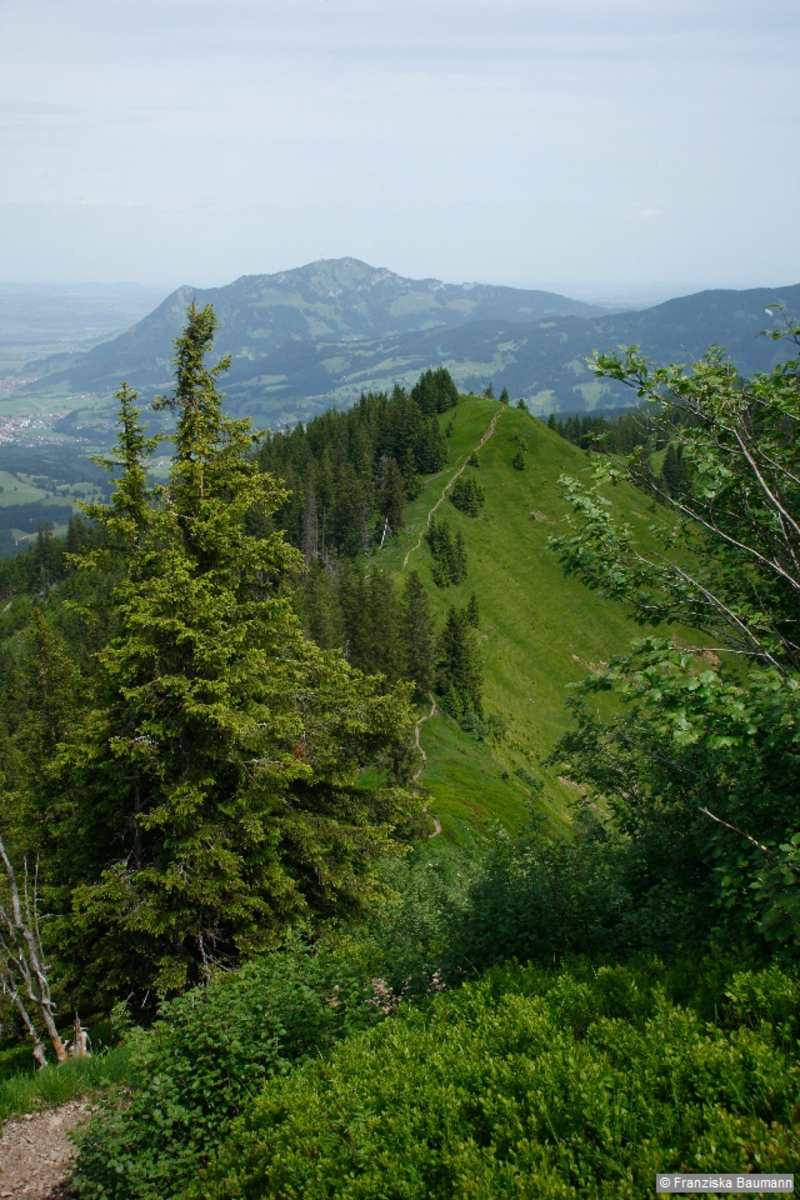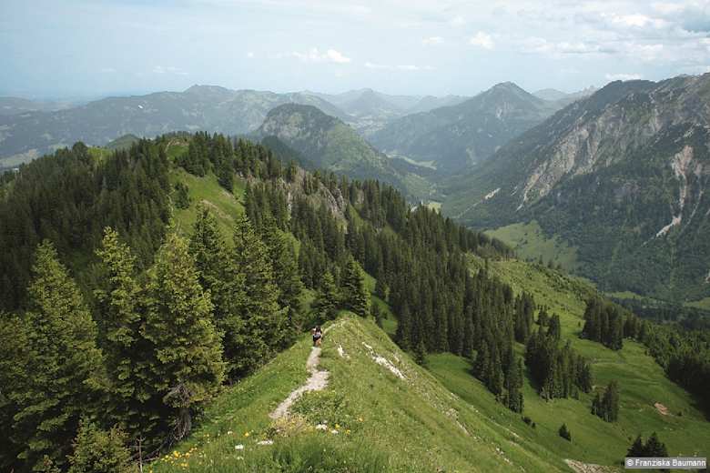 Gipfeltrio über dem Illertal im Allgäu: Eine Kammwanderung hat ihren besonderen Reiz, ist es doch oft ein genussvolles Gehen ohne allzu viele Höhenmeter, aber mit immer wieder neuen Ausblicken. So bietet auch der Bergrücken östlich über dem Illertal ganz unterschiedliche Panoramabilder. Da ist auf der Ostseite das urwüchsige Retterschwanger Tal, das von den Felsflanken des Daumen-Massivs und einem gezackten Grat, dem Revier des Hindelanger Klettersteigs, überragt wird. Im Norden wacht der Grünten über den Eingang des Illertals. Ihm zu Füßen breitet sich der bunte Flickenteppich des Voralpenlands aus – große und kleine Ortschaften, Waldstücke, Wiesen und Felder in unterschiedlichsten Grüntönen. Auch die Zackenreihe der Allgäuer Alpen südlich von Oberstdorf rückt schließlich ins Blickfeld.