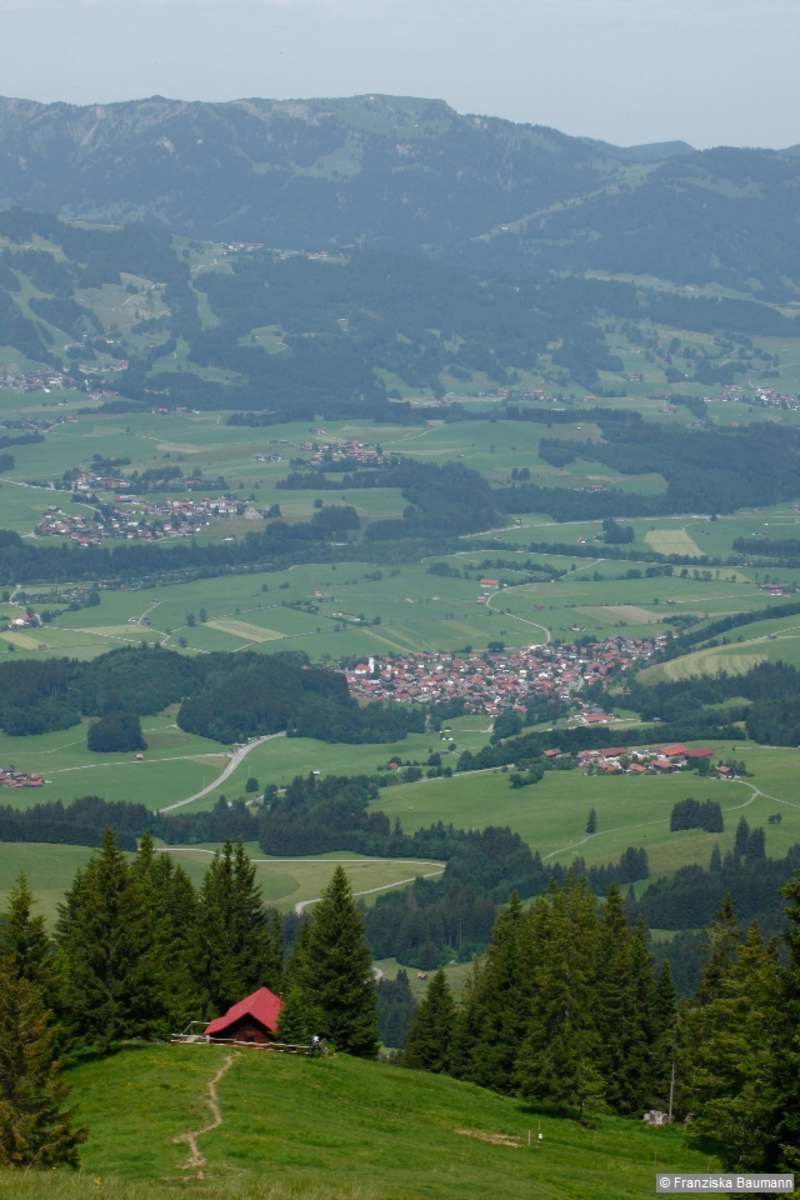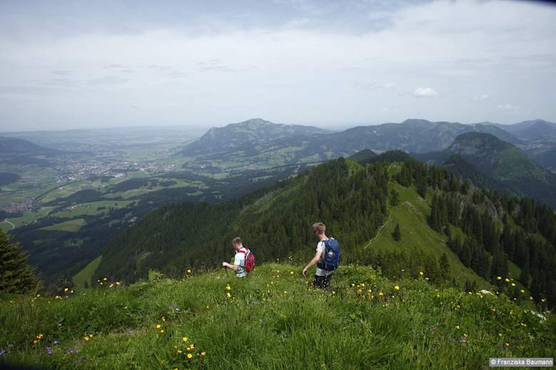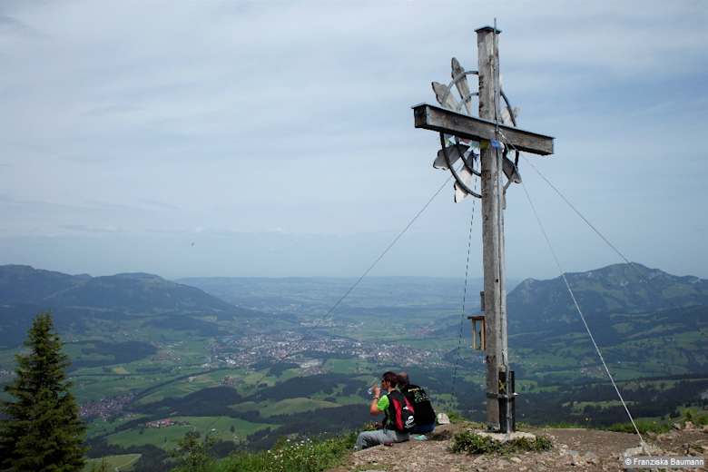 Vom Berghotel Sonnenklause wandern wir auf dem asphaltierten Sträßchen durch Wald weiter bergauf. Nach 15 Min. Anstieg kommen wir zu freiem Wiesengelände und folgen dem Schild »Wanderwege« links durch ein Weidegatter. Der Fußweg führt über die Wiese zu einem Forstweg, den wir kreuzen, und steigt über Weideflächen ziemlich steil an. Kurze Zeit sind wir auf einem breiten Alpweg unterwegs, halten uns dabei links und zweigen anschließend wieder nach rechts auf einen Steig ab. Weiterhin steil geht es zur privaten Dianahütte und zum Kamm Auf der Schnippe, 1.628 m, hinauf. Wir folgen dem Bergrücken nach rechts, haben nach 20 Min. den Gipfel des Sonnenkopfs erreicht und blicken hinunter in den Talkessel von Sonthofen.