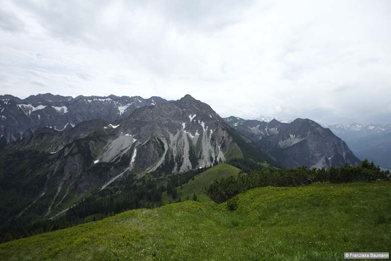 Unser Steig verläuft weiter am Kamm entlang nach Süden und erklimmt steil und steinig die nächste Anhöhe, die bezeichnenderweise Heidelbeerkopf, 1.767 m, heißt – Heidelbeersträucher säumen den Anstieg. Noch einmal wandern wir kurz in einen Sattel hinab und jenseits wieder hinauf, um das Gipfeltrio mit dem Schnippenkopf zu vervollständigen. Eine kurze Querung unterhalb des Gipfels ist dabei etwas abschüssig. Sein Grasgipfel hat die wuchtigen Bergklötze des Entschenkopfs und des Rubihorns als felsiges Gegenüber.