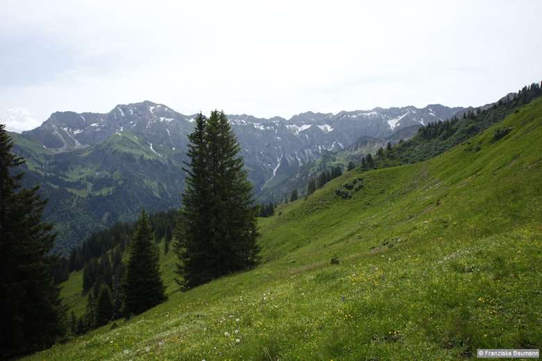 Der Abstiegsweg folgt noch ein Stück dem Kamm und führt dann zum Sattel mit der Falkenalpe, 1.700 m, hinunter, bei der wir rechts abbiegen. Wir gehen an der Vorderseite des Alpgebäudes vorbei und flach über die Wiesenhänge. Über einen Bergrücken gelangen wir in den von Bächen durchzogenen Kessel der Entschenalpe und steigen zu einem Fahrweg hinunter. Rechts geht es zur Hütte der Entschenalpe, 1.373 m, und anschließend auf einem breiten Kiesweg teils unangenehm steil abwärts, bis in einer Linkskurve nach rechts ein Waldweg abzweigt. Auf ihm setzen wir den Abstieg fort, halten uns an einer Wegkreuzung geradeaus und kehren zum Berghotel Sonnenklause zurück.