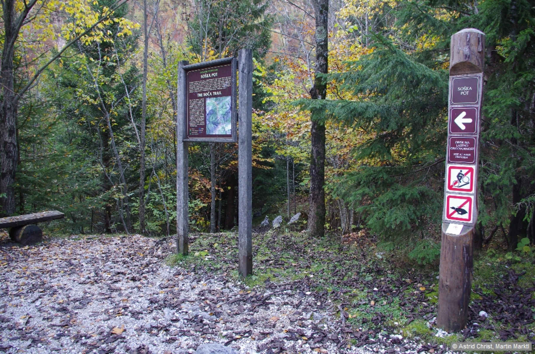Die heutige Etappe verläuft auf einem der ältesten Wanderwege des Nationalparks stets entlang der Soča. Kurz nach dem Sportplatz in Trenta, 620 m, beginnt unsere Fortsetzung des Soča-Trails, auf der (flussabwärts) linken Straßenseite. Über stabile Hängebrücken mit teils spektakulären Tiefblicken wechseln wir zweimal die Flussseite.