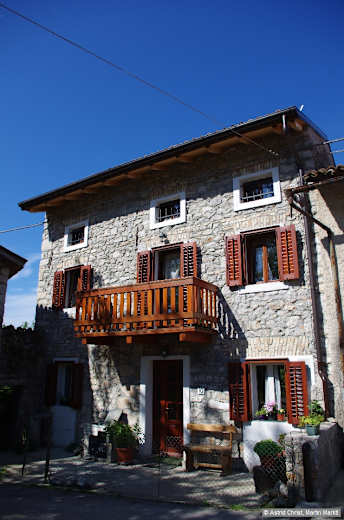 Im Ort gehen wir rechts an der Kirche vorbei und folgen der Straße bis zur Markierung des Wegs 72, der hier in Schotter übergeht. Hier stößt auch der SI wieder hinzu – wir folgen der Markierung beider Wege durch die reichhaltige Karstvegetation nach Marcottini, 107 m. Typisches Haus in San Martino del Carso Foto: Astrid Christ, Martin Marktl, Rother Bergverlag