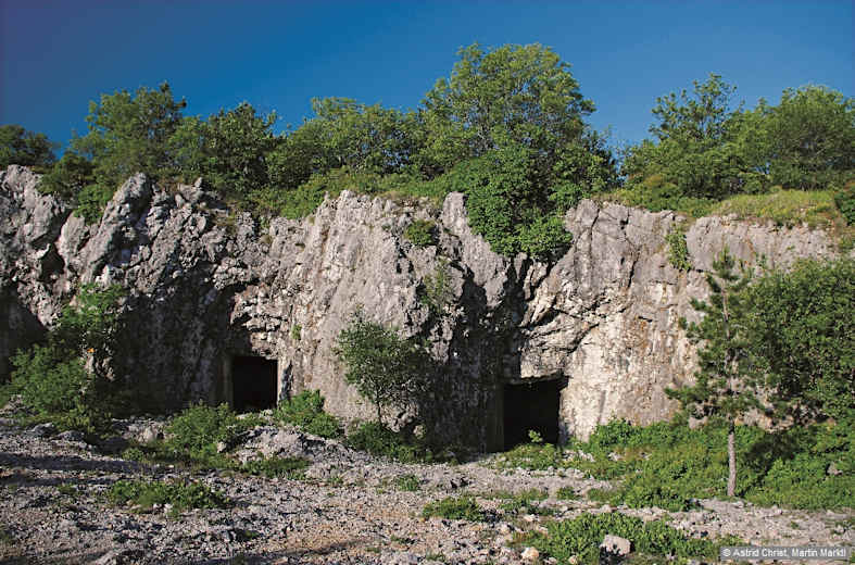 Ein Rundweg führt hier vorbei an Bunkern und Aussichtswarten, für uns empfiehlt sich die Gehrichtung im Uhrzeigersinn. Kurz bevor wir wieder den Eingangsbereich erreichen, verlassen wir die Runde und folgen einem beschilderten Steig hinunter nach San Martino del Carso, 189 m. Foto: Astrid Christ, Martin Marktl, Rother Bergverlag