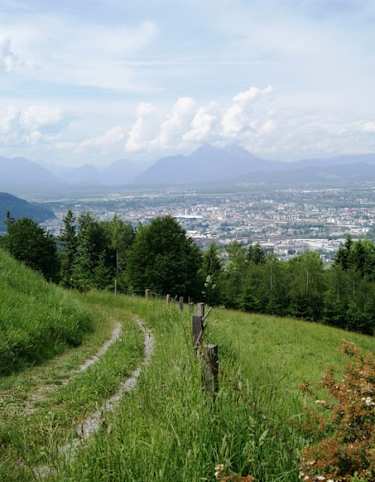 Auf weiterhin asphaltierter Straße 15 Min. steil hinauf – vorbei am schön gelegenen Stiedlerlehen – bis zum Untersberghof. Am Gatter nun links (Lama-Gehege) und auf Wald- und Wiesenweg nach Obergern, das wir beim Stadlerhof erreichen. Die nun wieder asphaltierte Straße führt aussichtsreich und ziemlich eben bis zum Ascherlehen. Von hier nun auf breitem Waldweg steil hinab zum Planitschlehen. Wir folgen ein kurzes Stück der Teerstraße, bis links der Steig nach Bischofswiesen / Berchtesgaden abzweigt, der uns zuerst zum Klapflehen führt. (Hier bietet sich ein Abkürzer nach Maria Gern an.)