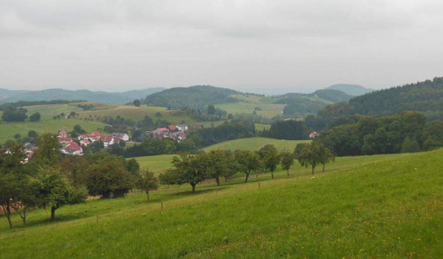 Es geht um den Steinkopf und weiter zum Wanderparkplatz „Am Schütze-Kreuz“. Über freies Gelände wandert man den Reichelsberg hinauf. Es geht in östlicher Richtung zur L308 und wenig später nach links. Über Wiesen und Felder wandert man hinauf zum Götzenstein. Weiter geht es zur Anhöhe von Schnorrenbach, wo man einen schönen Ausblick genießt. Der Weg führt um den Kisselbusch und weiter zum Waldrand, dem man ein Stück folgt.