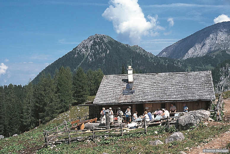Dort geradeaus weiter und ein kurzes Stück über eine Geländestufe steil hinauf. Im gemächlichen Auf und Ab erreicht man dann bald die Branntwein-Brennhütte, 1.352 m. Dort wird turnusmäßig Enzianschnaps gebrannt – mit etwas Glück kann man ein „Stamperl“ probieren. Anschließend geht es auf breitem Almweg hinauf zu den Priesbergalmen, die man nach 1.30 Std. erreicht.