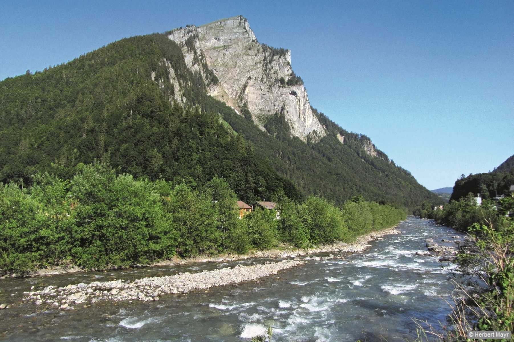 An der Kirche in Jaghausen nehmen wir kurz den Gehsteig der nach Mellau führenden Bundesstraße, gehen über die Achbrücke und folgen dem Sträßchen Richtung Kanisfluh. Foto: Herbert Mayr, Bergverlag Rother GmbH Das Felsbollwerk der Kanisfluh gilt als Wahrzeichen des Bregenzerwaldes. Foto: Herbert Mayr, Bergverlag Rother GmbH Bildergalerie (2)