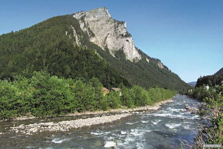 An der Kirche in Jaghausen nehmen wir ganz kurz den Gehsteig der nach Mellau führenden Bundesstraße, gehen über die untere Achbrücke und folgen dem Sträßchen Richtung Kanisfluh zum ruhigen Ortsteil Argenstein. Hinter den letzten Häusern leitet ein Pfad durch den Mischwald empor und ein anschließender Güterweg durch das noch überwiegend im alten Stil erhaltene Ahornen-Berggut, später durch das Ahornen-Vorsäß, 1.090 m. Schön ist die Ausschau zu den eleganten Allgäuer Bergspitzen hinter Schoppernau und in das gegenüber des Argenbachs beginnende Lechquellengebirge. Der weiterhin zu unserem Gipfelziel ausgeschilderte Aufstieg, zwischendurch als Wanderweg, passiert nach einem Waldflecken die Feuersteinalpe, 1.350 m. Unter der breiten Südabdachung der Kanisfluh geht’s über kärgliche Alpweiden recht gemütlich an der Waldgrenze entlang, linker Hand der Klipperen.