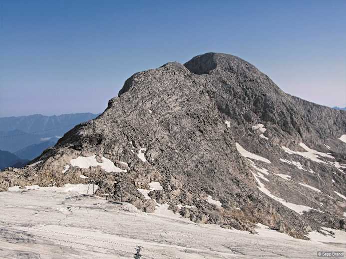 Von der Bergstation am Hunerkogel steigen wir auf einer Steintreppe zum Firnfeld des Hallstätter Gletschers ab, drehen aber schon nach einigen Minuten von der zur Dachsteinwarte führenden Wandertrasse rechts ab und steuern über ein mäßig geneigtes Firnfeld den etwas tiefer liegenden, gut sichtbaren Gjaidsteinsattel an. Dort setzt der felsige Südwestgrat zu den beiden Gjaidsteinen an, dem wir auf der welligen Schneid bis zum Hohen Gjaidstein folgen. Nach den ersten Felsen passieren wir einen Wegweiser und kurz darauf eine Hütte des Bergrettungsdienstes. Dann führt uns der teils brüchige, teils kompakte und an zwei Stellen mit Stahlseil gesicherte Gratrücken auf den Kleinen Gjaidstein. Der weitere Grat zum gut sichtbaren Hohen Gjaidstein verläuft recht wellig und ist an schmalen, steileren Felspassagen gut gesichert. Zuerst geht es am Stahlseil in eine Scharte hinab, dann wellig über eine unbenannte Gratkuppe hinweg und nach der folgenden, unbedeutenden Einschartung am Stahlseil über einen plattigen Grat und zuletzt über einen mäßig geneigten Geröllrücken auf den kreuzgeschmückten Hohen Gjaidstein.