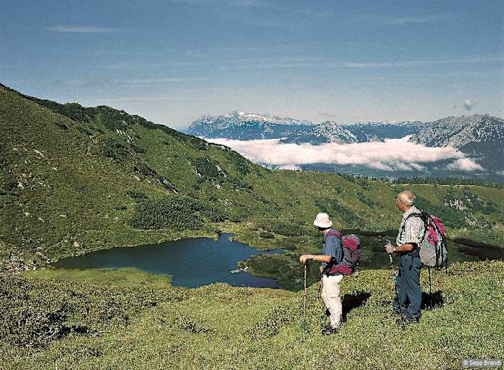 Mehrere gastliche Almen, ein weites, gestuftes Kar mit reizvollen Lacken, ein langer, gut gangbarer Grat sowie ein geologischer Lehrpfad um das Gumpenkar herum charakterisieren die Wanderung auf die aussichtsreiche Graskuppe des Gumpeneck. Foto: Sepp Brandl, Bergverlag Rother GmbH
