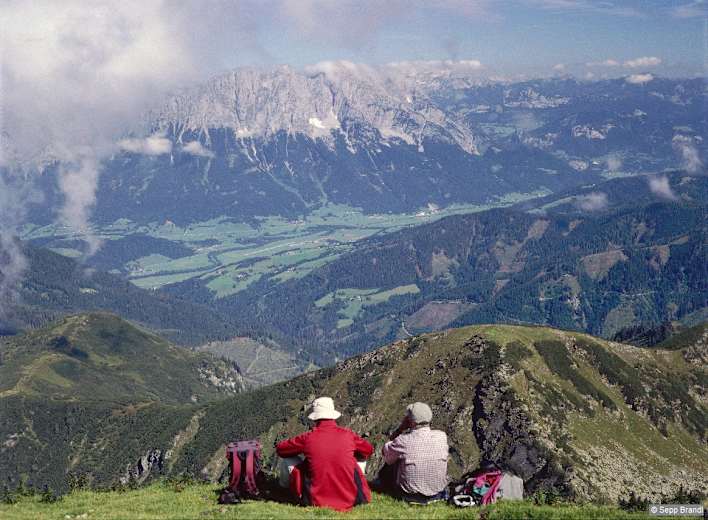 An der Schleinhütte, dahinter von links Dachstein, Stoderzinken und Kammspitze. Foto: Sepp Brandl, Bergverlag Rother GmbH