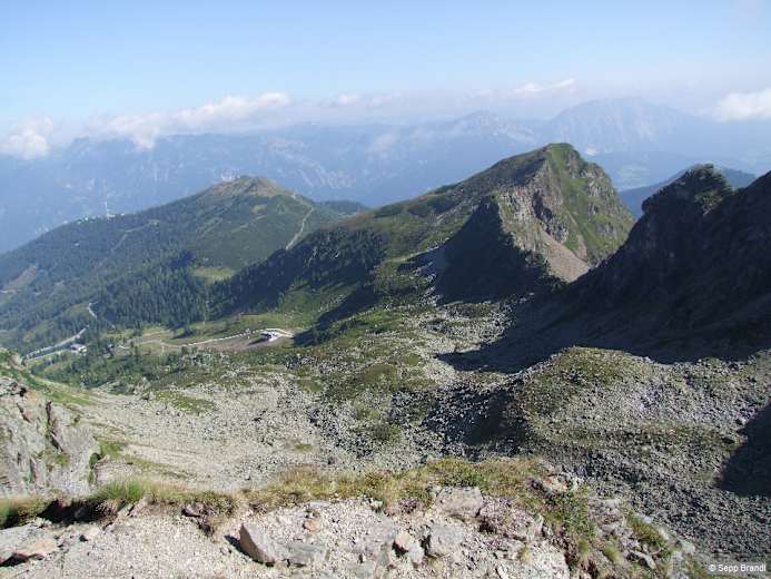 Über die Aufstiegsroute bis zur Kaltenbachschulter hinab. Dort links abzweigen und zuerst über einen schotterigen Steilhang, dann durch zwei Blockfelder mühsam zur Oberen Filzscharte. Auf gut gangbarem Steig zur Unteren Filzscharte, dort erneut links ab und zuerst über eine schrofige Karmulde, zuletzt über Bergweiden zum reizvollen Moaralmsee hinab. Über dessen Abfluss hinweg, dann rechts ab und auf Weg Nr. 45 im mehrfachen Auf und Ab über Grashänge, durch Gebüsch und Blockwerk von der steilen Ost- auf die Nordseite der Bärfallspitze und zuletzt mäßig steigend auf den Roßfeldsattel. Von hier auf bekannter Route zur Bergstation.