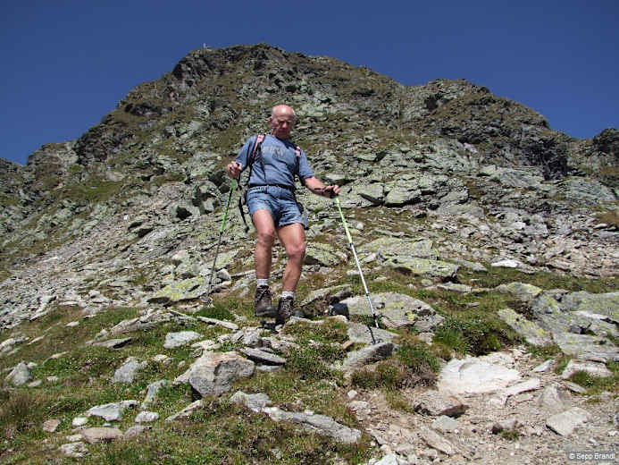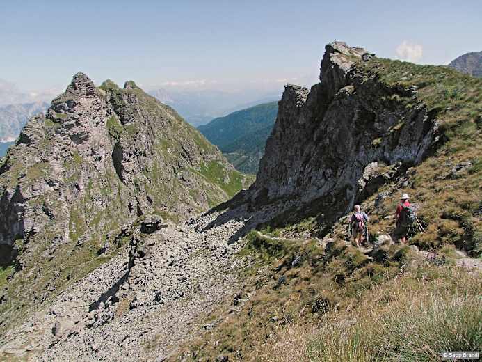 Über die Aufstiegsroute bis zur Kaltenbachschulter hinab. Dort links abzweigen und zuerst über einen schotterigen Steilhang. Foto: Sepp Brandl, Bergverlag Rother GmbH