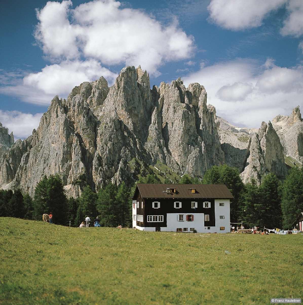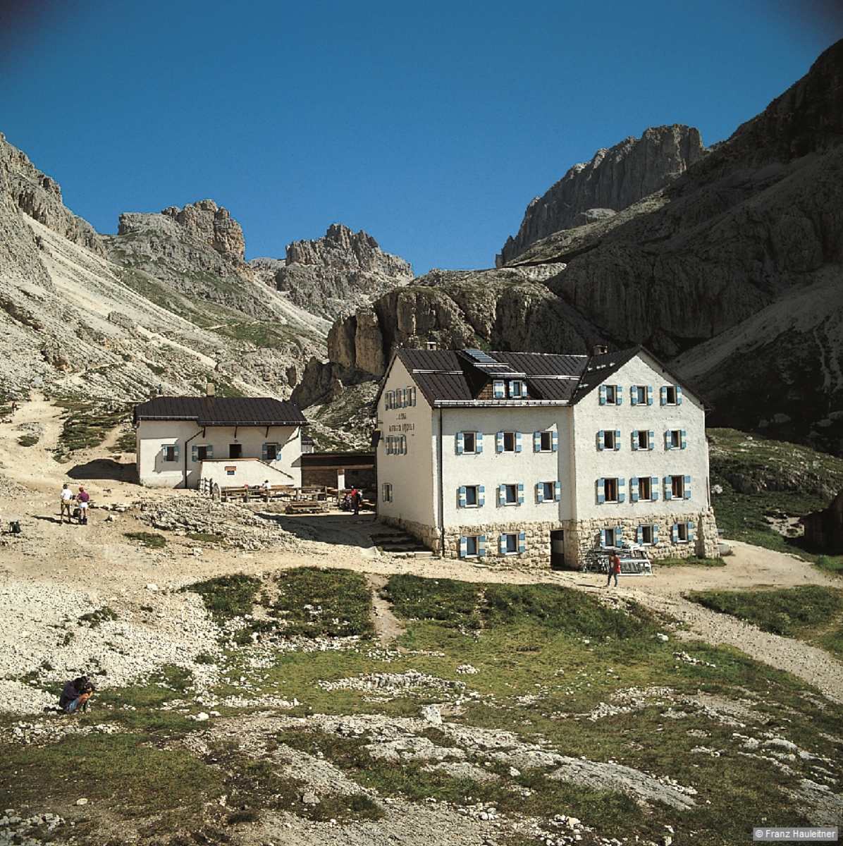 Auf der Bergschulter von Ciampedie. Im Norden die Larsecgruppe mit dem Passo delle Scalette rechts. Foto: Franz Hauleitner, Rother Bergverlag Das Rifugio Gardeccia im Vajolettal mit den Vajolettürmen im Hintergrund. Foto: Franz Hauleitner, Rother Bergverlag Die Vajolethütte; dahinter Grasleitenpass und Kesselkogel. Foto: Franz Hauleitner, Rother Bergverlag Im Abstieg vom Cigoladepass passiert man am Wandfuß der Südlichen Mugonispitze diesen ungewöhnlichen Durchschlupf. Foto: Franz Hauleitner, Rother Bergverlag Das schöne Felsband am Fassaner Höhenweg. Foto: Franz Hauleitner, Rother Bergverlag Bildergalerie (5)