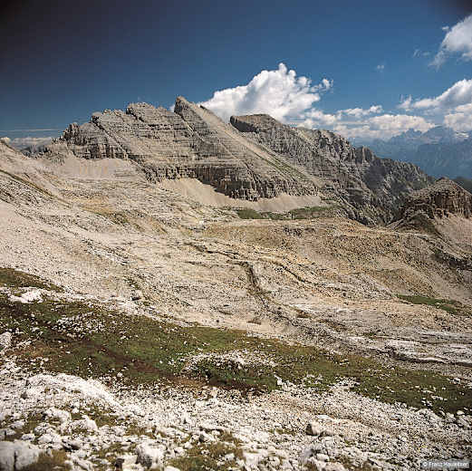 Nun auf Weg Nr. 517B an den Abhängen der C. Poppe steil nach Südwesten zu einem Sattel unter den Felsen empor. Nach links queren, dann im felsigen Gelände hinauf, zuletzt über Wiesen zur Kleinen Latemarscharte, 2.528 m, mit dem Querweg Nr. 18. Auf diesem gegen den Col Cornon über Schutt nach links aufwärts und in die Südseite des Berges.