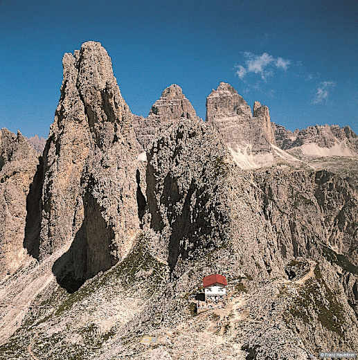 Rifugio Fonda Savio und Torre Wundt von Süden, im Hintergrund die Drei Zinnen. Foto: Franz Hauleitner, Rother Bergverlag