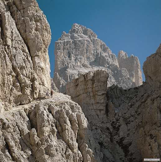 Am nördlichen Bonacossaweg, über dem zerklüfteten Felskamm des Monte Campedelle die Große Zinne. Foto: Franz Hauleitner, Rother Bergverlag