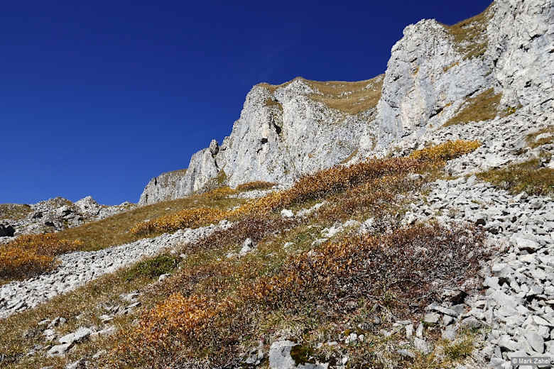 Beim Abstieg folgen wir dem besagten Eugen-Köhler-Weg tiefer auf die Geländeabdachung hinab, holen dabei relativ weit nach links gegen das Rote Loch aus und geraten mit einem Rechtsknick in den unvermeidlichen Steilriegel, und zwar an seiner schwächsten Stelle. Plattiger, abwärts geschichteter Fels gemahnt hier zur Vorsicht, doch helfen Drahtseile und eingebohrte Trittschienen. Teils schräg abwärts, teils auch mal über Schuttfelder querend läuft die Route ins begrünte, deutlich flachere Gelände hinein: Übergang in die Flyschzone.