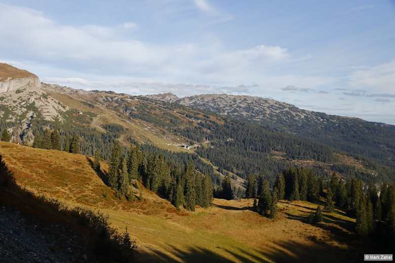 Von der Heubergbahn zunächst ein wenig abwärts zum Schöntalhof, 1.324 m, dort links haltend in den Wald und zu einer Kreuzung, wo der unter Variante Nr. 4 erwähnte Zugang von der Ifenstraße dazukommt. Nun folgen wir dem mäßig ansteigenden Güterweg bis zur Unteren Walmendinger Alpe, 1.444 m. Es schließt sich ein Steig an, der am Rande eines Tobels teils recht kräftig aufwärtszieht und dann die Geländeschwelle zur Oberen Walmendinger Alpe, ca. 1.600 m, überschreitet. Dort öffnet sich ein schöner Kessel.