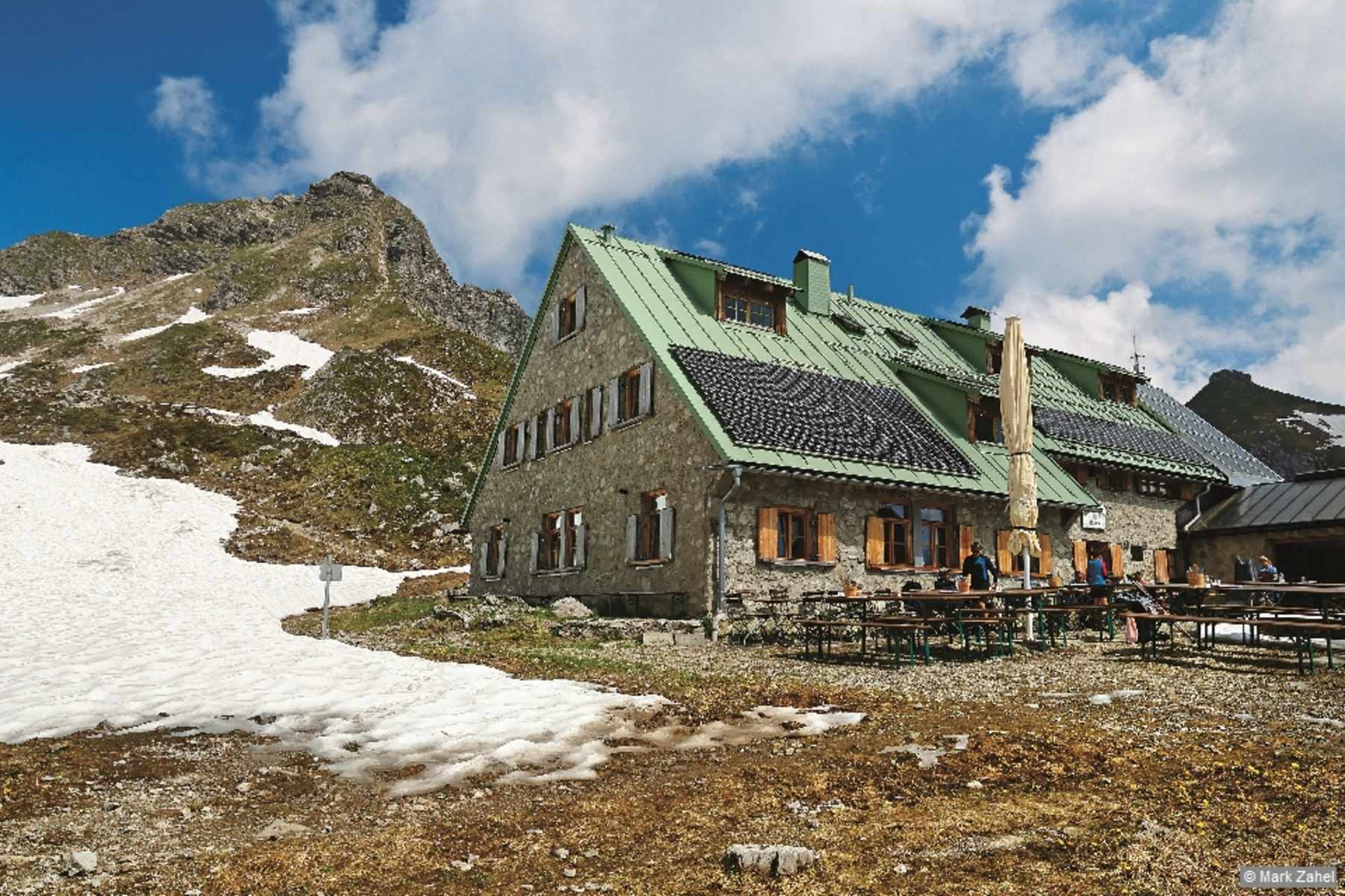 Sonnenaufgang bei der Fiderepasshütte. Foto: Mark Zahel, Bergverlag Rother GmbH Grandiose Aussicht vom Krumbacher Höhenweg auf den Allgäuer Hauptkamm jenseits des Rappenalpentals. Foto: Mark Zahel, Bergverlag Rother GmbH Der Krumbacher Höhenweg schneidet die sonnseitigen Hänge der Schafalpenköpfe. Foto: Mark Zahel, Bergverlag Rother GmbH Wenn der Schnee im Juni allmählich abschmilzt, lockt die Mindelheimer Hütte wieder zahlreiche Gäste an. Foto: Mark Zahel, Bergverlag Rother GmbH Bildergalerie (4)