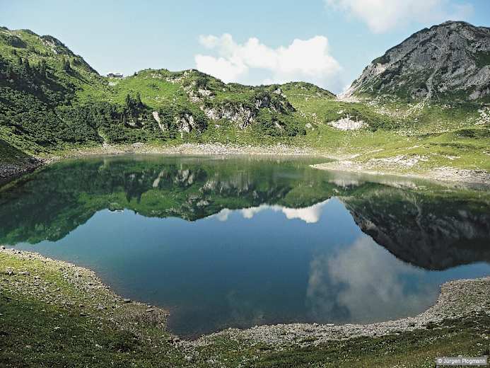 Der Ortsbus bringt uns von Lech zur Endhaltestelle Formarinsee. Diese liegt auf einem kleinen Pass, 1.871 m, zwischen Formarinalpe und Formarinsee. Zum idyllischen, zwischen den rauen Kalkbergen des Lechquellengebirges liegenden Formarinsee abzusteigen, ist ein „Muss“. Nördlich über ihm erhebt sich die Rote Wand, das vermutete Quellgebiet des Formarinbachs. Im Süden schaut die Freiburger Hütte des Deutschen Alpenvereins auf den See. Je nach Standort, Sonnenstand und Luftbewegungen spiegelt sich die Landschaft auf der Seeoberfläche.