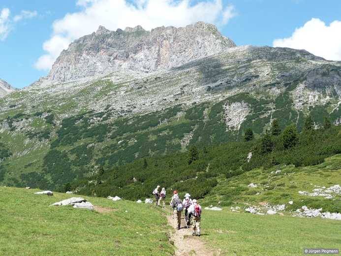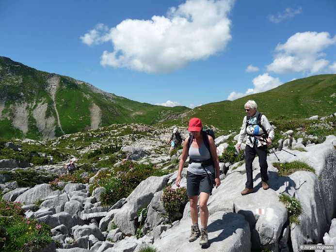 Von der Freiburger Hütte geht es auf dem Europäischen Fernwanderweg E 4 durch Almweiden überwiegend aufwärts zum Beginn des Steinernen Meeres, 2.100 m (1 Std.). Die verzwickte Wegführung durch die Karrenfelder erlaubt hier kein schnelles Fortkommen mehr. Bei Nässe ist sicheres Gehen auf dem glatten Kalk gefragt. Fundstellen von Fossilien am Weg sind durch Metallhülsen gekennzeichnet. Bevor wir den E 4 nach weiteren etwa 45 Minuten verlassen müssen, bieten sich eine Ansammlung von Megalodonten (Kuhtrittmuscheln) sowie das Steinbockhorn, eine angeschnittene Riesenmuschel, an. Gehen wir über unseren Abzweig zur Formarinalpe wenige Meter auf dem E 4 Richtung Gehrengrat, Spullersee und Zürs geradeaus, so stoßen wir auf unzählige Ammoniten, Belemniten und Nautiliden. Beim Abstieg zur Formarinalpe ist rechts des Weges ein kleines Korallenriff zu entdecken. Nach 45-minütigem Abstieg auf dem Pfad mit moderatem Gefälle treffen wir unterhalb des Steinbockdenkmals auf den Lechweg.